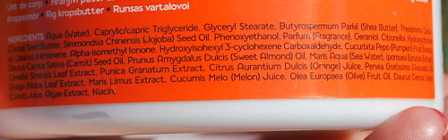 Din punctul de vedere al compozitiei contine ingrediente cu putere de hidratare, ingrediente emoliente, ingrediente regeneratoare, conservanti admisi de Soil Association – adica ingrediente corecte si bune pentru corp.